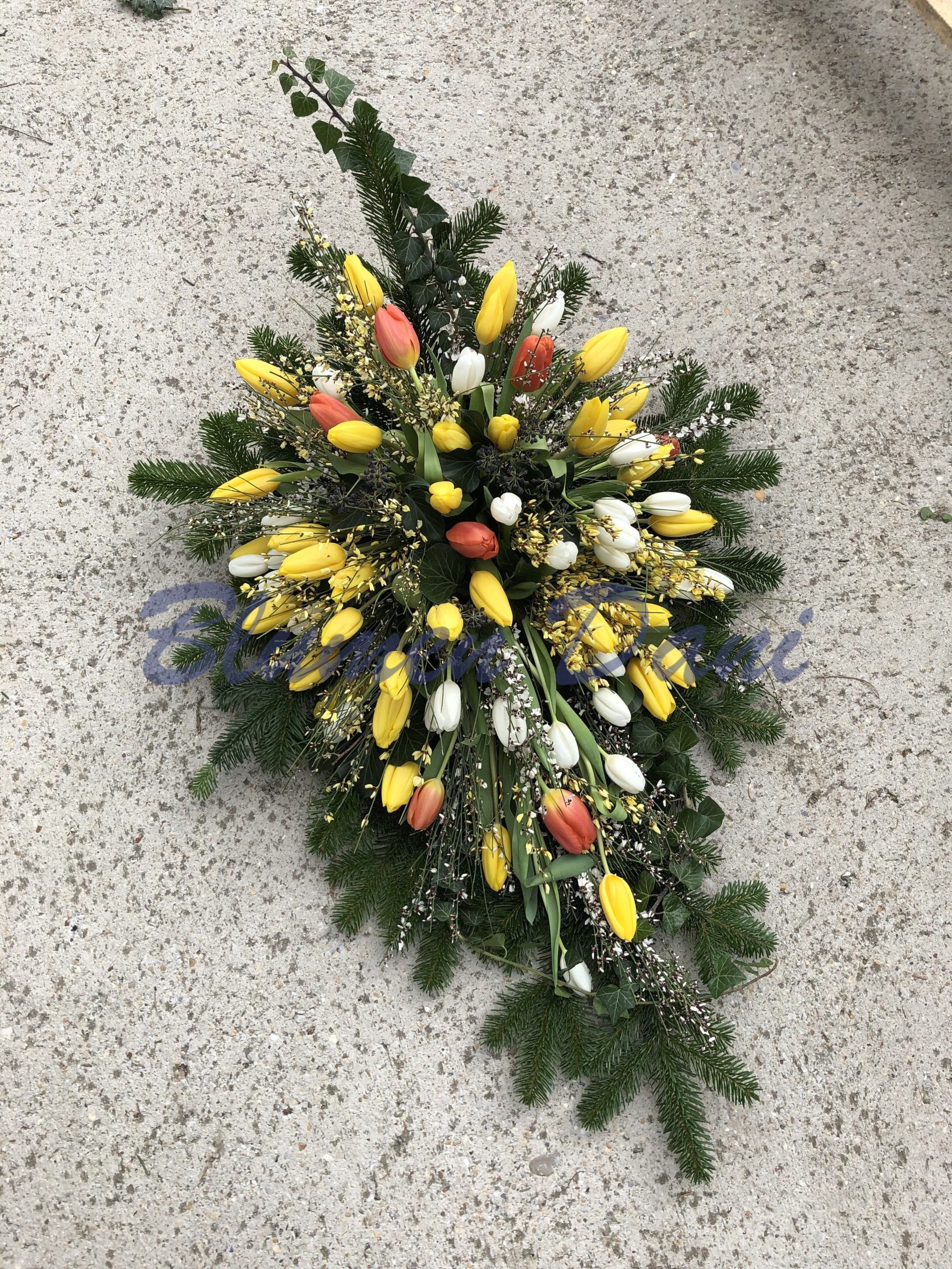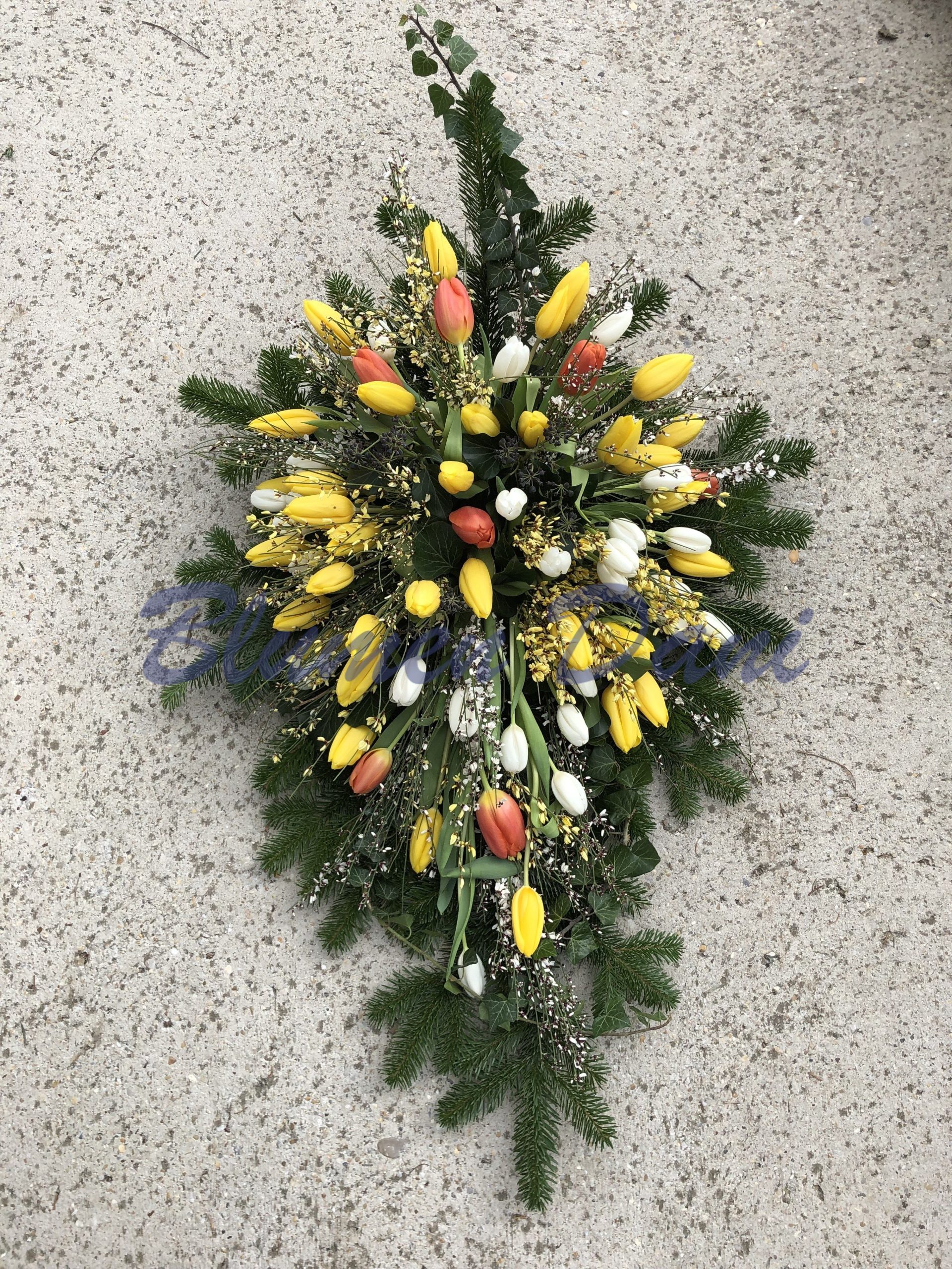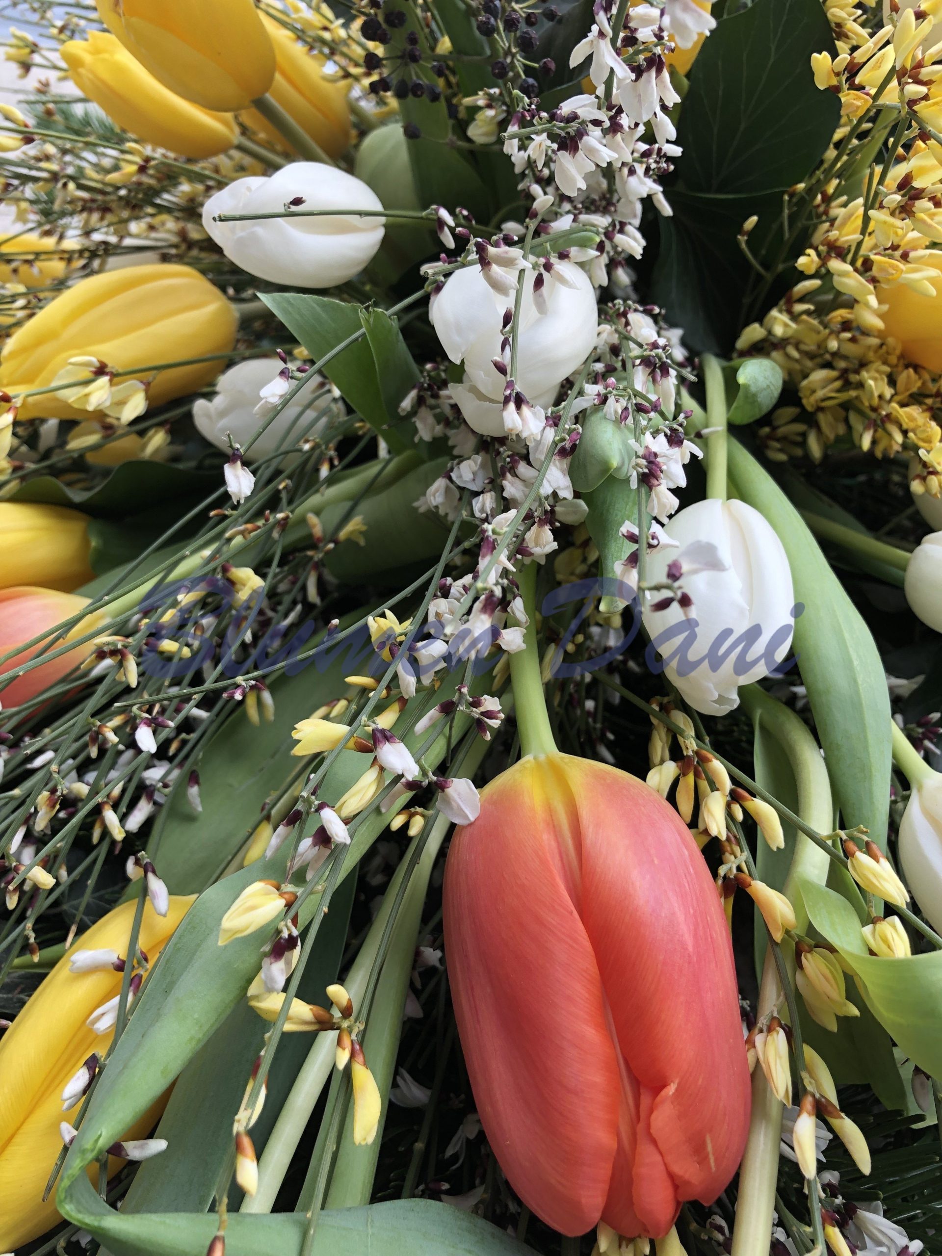 Das Bukett mit Tulpen besteht aus Tannenreisig und passendem Beiwerk, welche in eine Steckschwammunterlage gesteckt werden. Der Preis errechnet sich aus der Größe des Buketts und der Anzahl der Blumen. Wir bieten folgende Größen an: