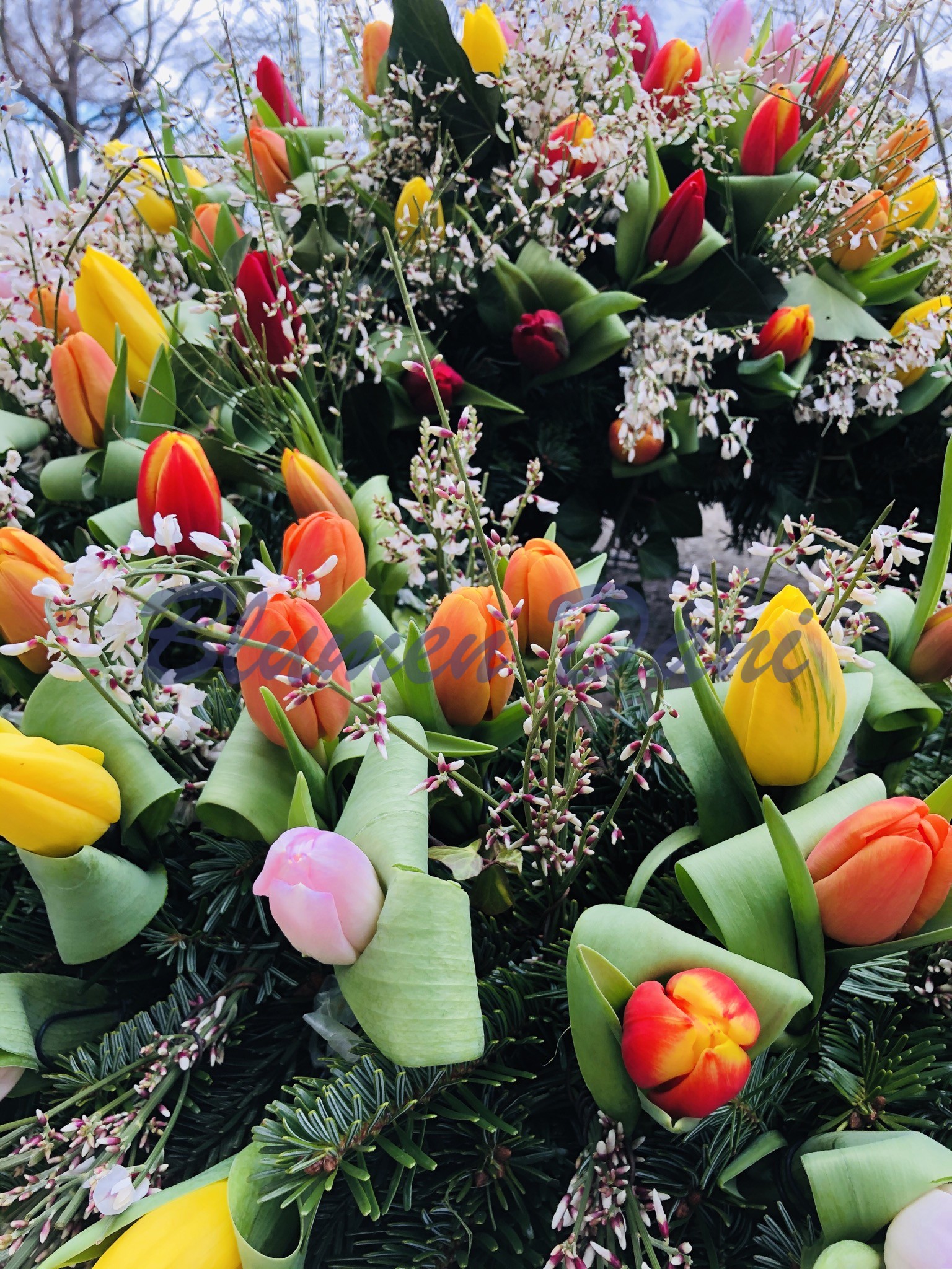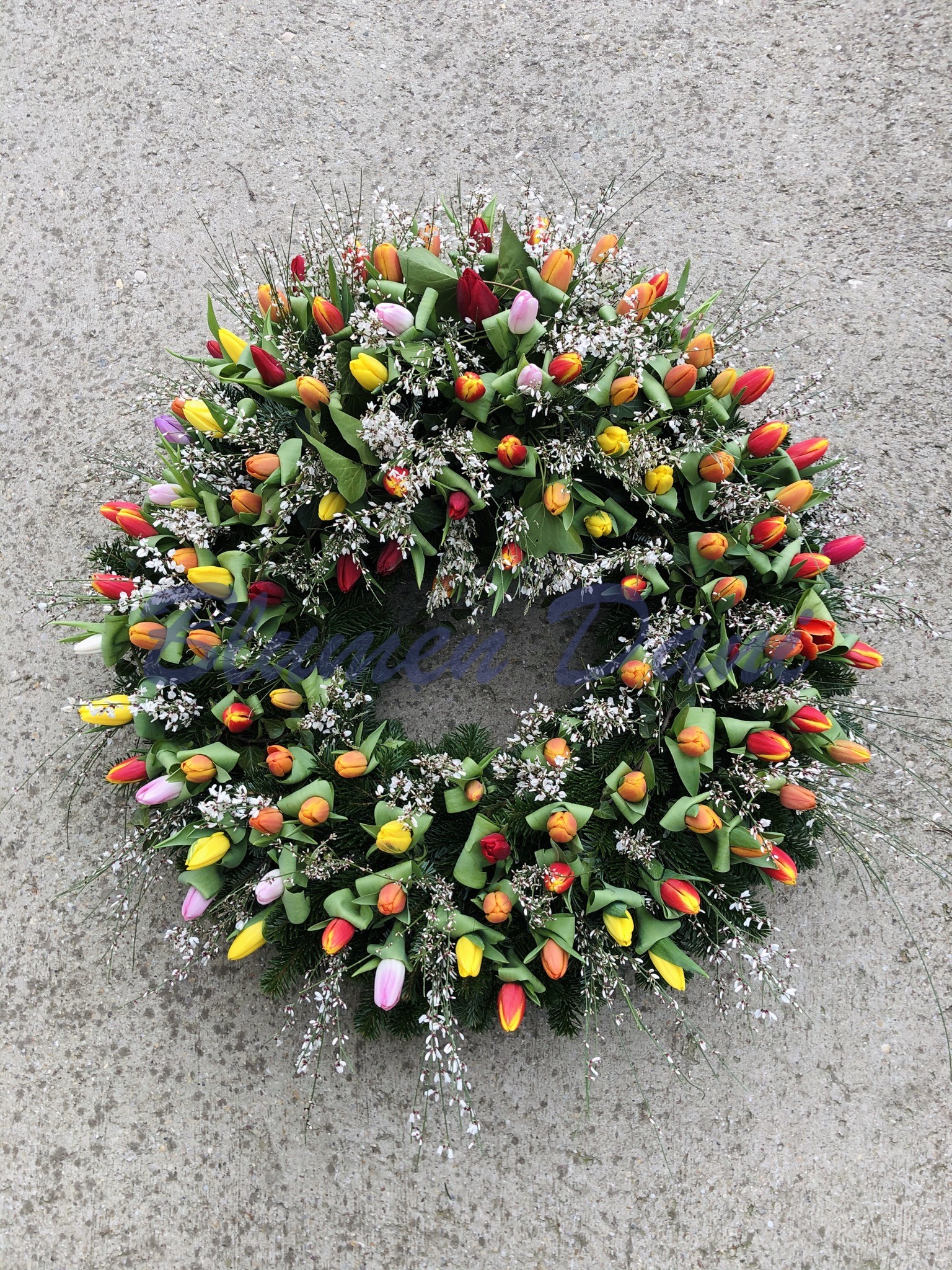 Der vollgesteckte Kranz mit Tulpen und passendem Beiwerk, ist auf einem mit Reisig gebundenen Wiener Hochreifen montiert. Der Preis errechnet sich aus dem Durchmesser und Anzahl der im Kranz gesteckten Blumen. Es gibt den Kranz in folgenden Größen: